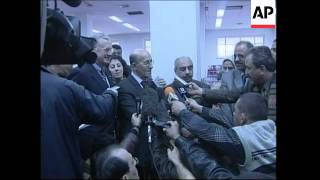 1. Wide of money exchange point guarded by US self-propelled howitzers 2. Various of Iraqis standing in long lines to change the old bills 3. Various of US ...